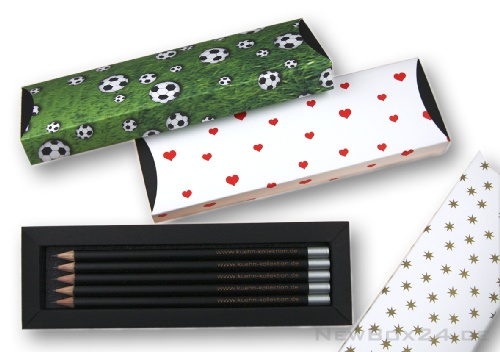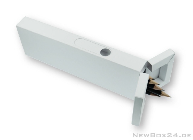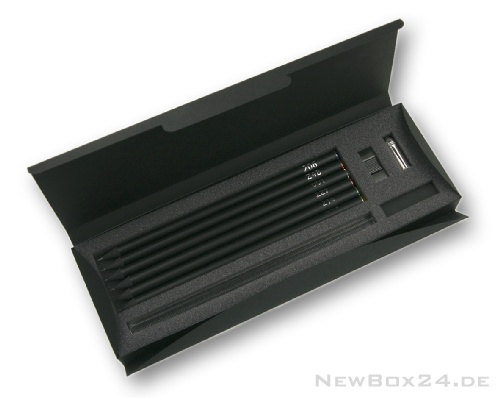 Dank speziell ausgestanzter Schaumstoffeinlagen können auch Bleistift-Sets (z. B. mit Lineal, Radiergummi und Anspitzer) und andere Schreibgeräte attraktiv verpackt werden.