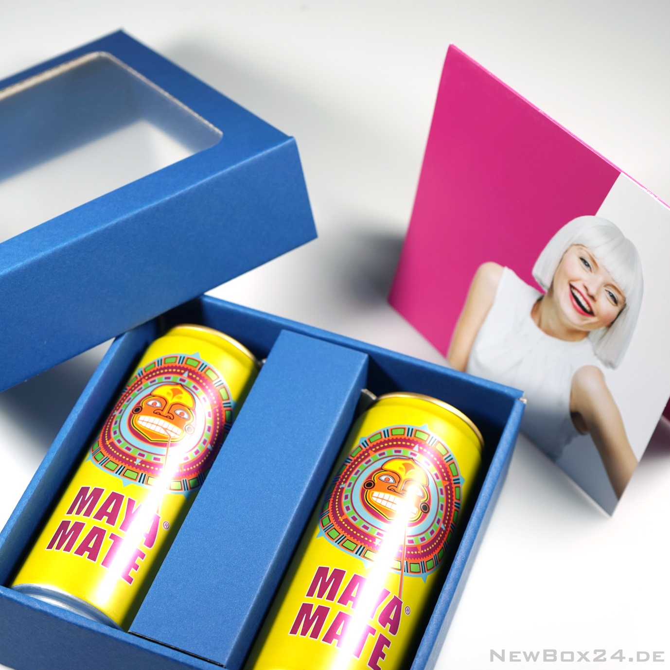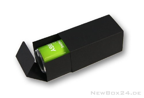 Der Inhalt - eine Dose mit Energy-Drink - liegt auf einer passgenauen Kartoneinlage. Besonders attraktiv und voller Dynamik präsentiert sich das Farbenspiel mit unterschiedlichen Kartons - passend zur Werbebotschaft des Auftraggebers.