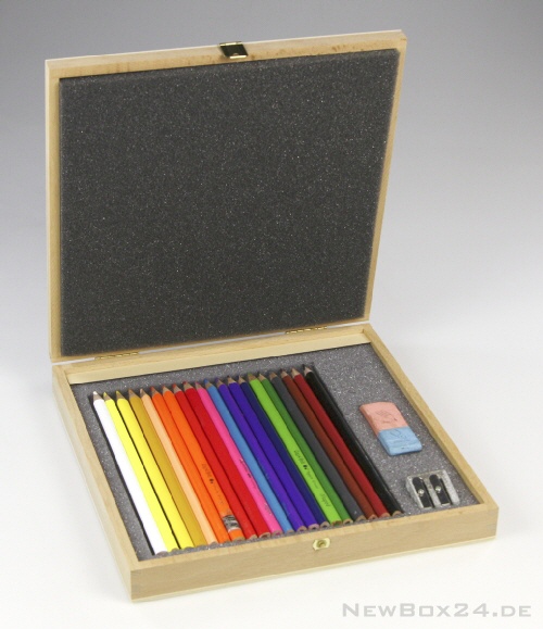 Für ein besonderes Set an Farbstiften inklusive Radiergummi und Anspitzer wurden verschiedene Lösungen ausgearbeitet. Der Vorteil einer Holzkassette ist, dass durch die eingelegten Schaumstoffe al...