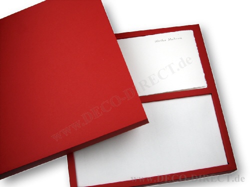 Eine Geschenkverpackung für besonderes Briefpapier und passende Kuverts - in verschiedenen Farbvarianten und alternativ mit einem Gravurschild in Silbermetallic.