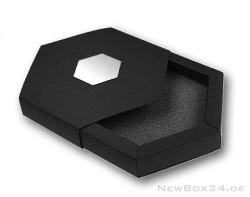 Gravurschild silbermetallic auf einer Schmuckverpackung Serie Sechseck in schwarz.