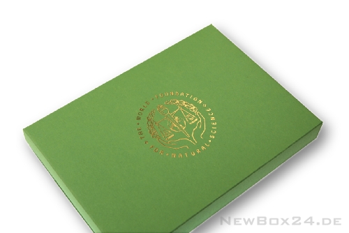 Goldprägung auf einer Designverpackung 110, passend für Postkarten, in hellgrün.