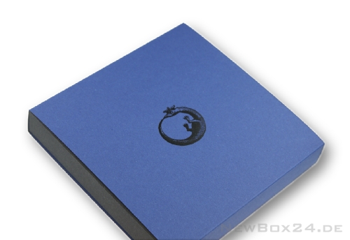 Heißprägung mit schwarzer Folie auf einer VARIO COLOR Schiebebox in den Farben blau/schwarz.