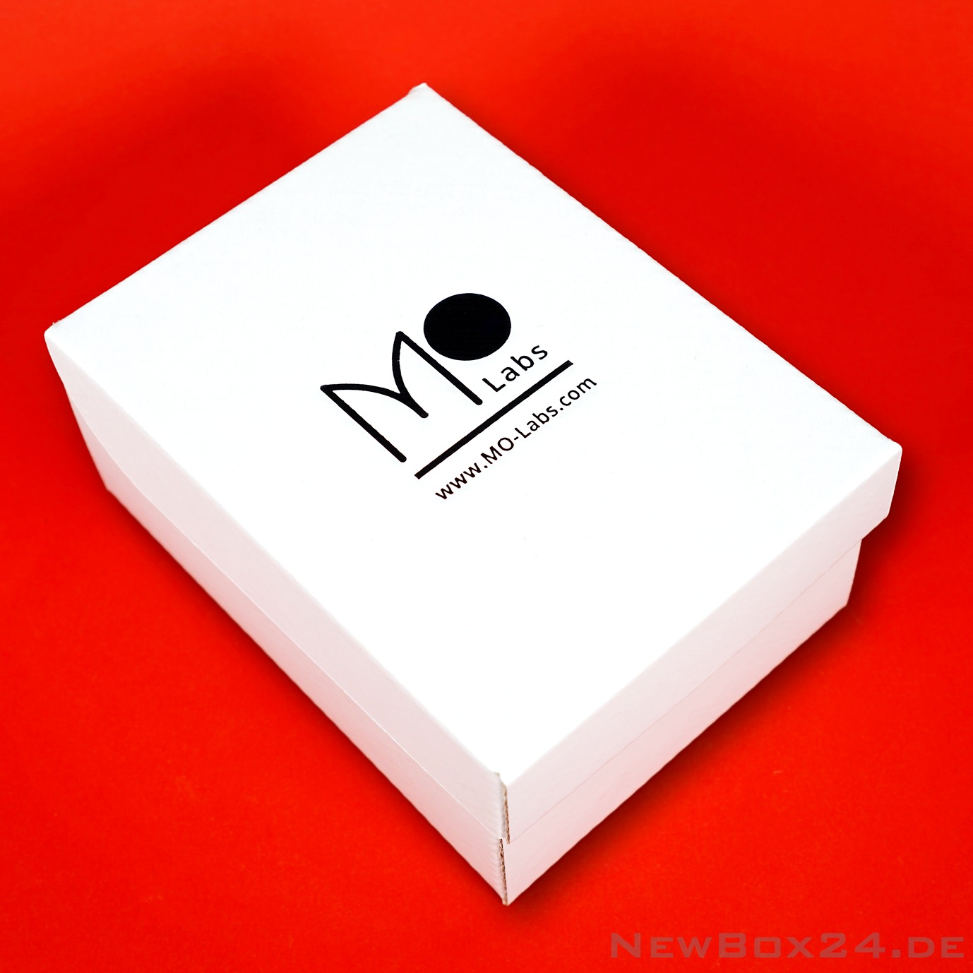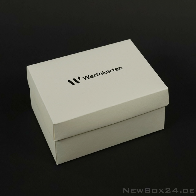 Heißprägung mit schwarzer Folie auf einer Klappdeckelbox 216 aus glattem Wellkarton in der Farbe Weiß.
