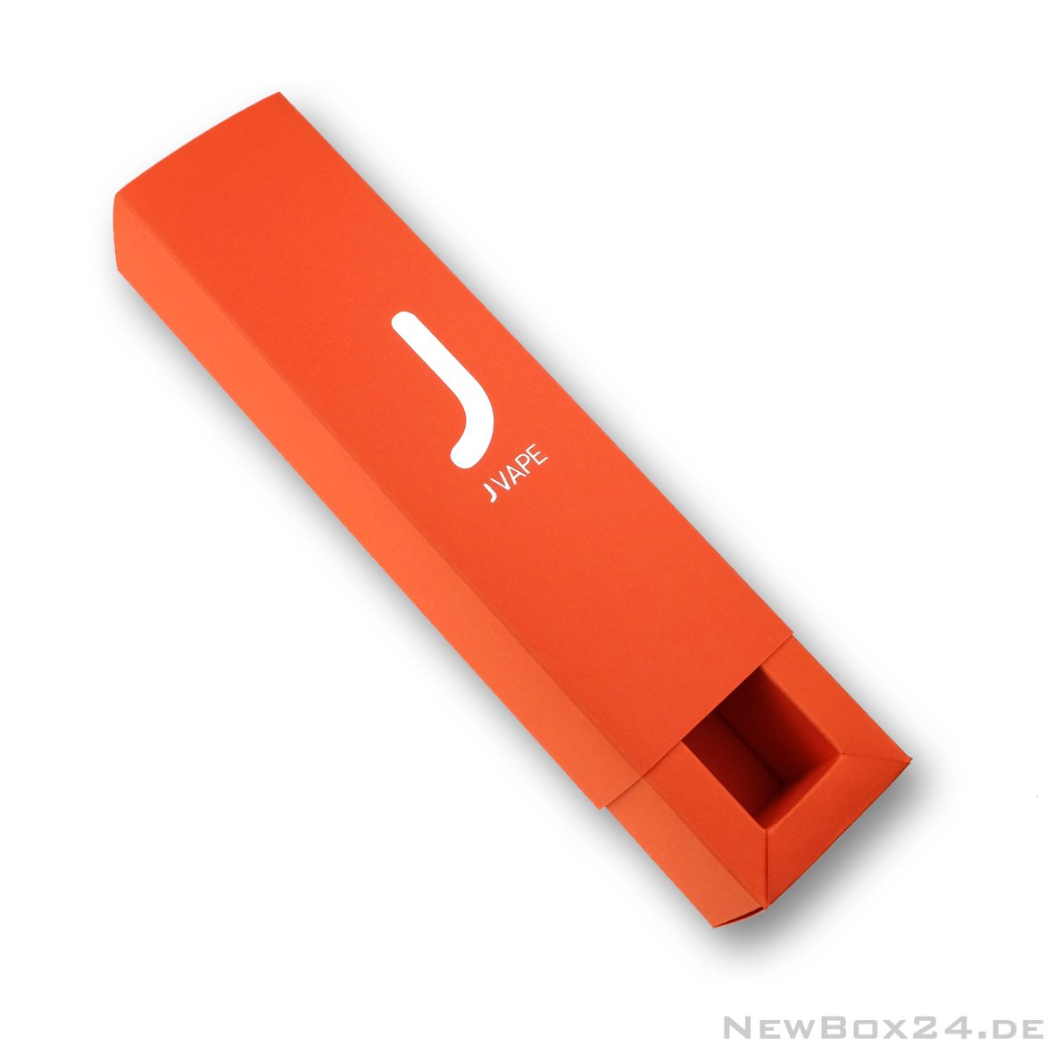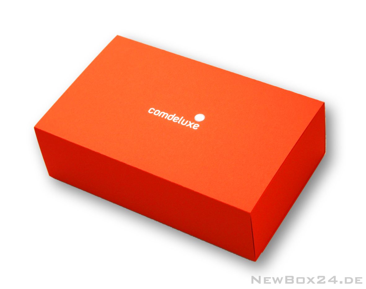 Silberprägung auf einer Schiebe-Geschenkverpackung aus Karton in orange.
