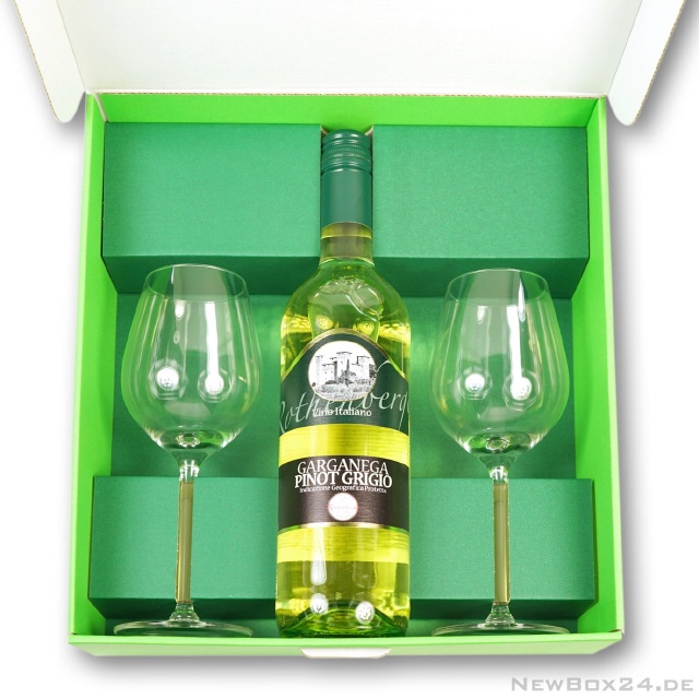 Die exakt passende Kartoneinlagen für diese Gläserverpackung sorgt dafür, dass die beiden Sektgläser sich nicht berühren und so besser für den Transport geschützt sind.