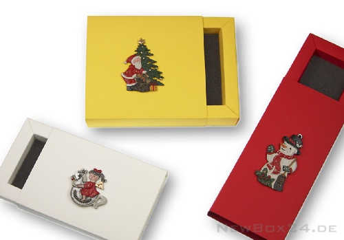 Handbemalte Zinnfiguren zieren verschiedenfarbige Schmuckverpackungen. Sie machen aus einer einfachen Geschenkverpackung eine individuelle Geschenkidee.